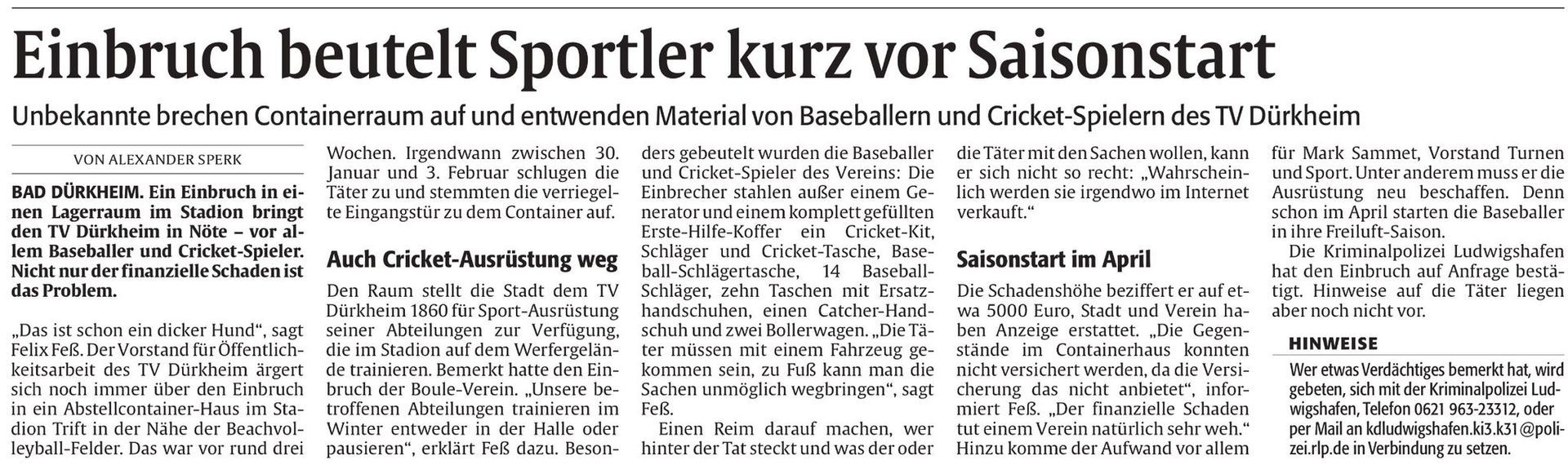 Einen Schock hat der Einbruch in einen Container bei den Beachvolleyballfeldern zwischen den Monaten Januar und Februar bei uns ausgelöst. Entwendet wurde Equipment der Gruppen Baseball und Cricket im Wert von in Summe ca. 5.000€. Da keine Versicherung greift bleibt der TVD auf diesem enormen Schaden sitzen, Spenden werden gerne entgegen genommen. Details zum Einbruch lest ihr im Zeitungsartikel vom 24.02.2026 aus DIE RHEINPFALZ.